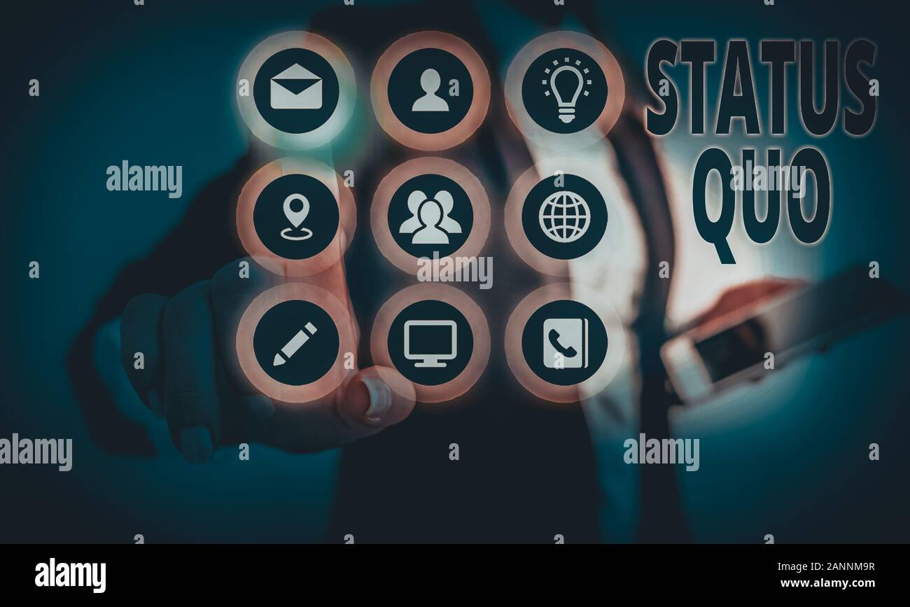 Conceptual Hand Writing Showing Status Quo Concept Meaning Existing Stock Photo Picture And Royalty Free Image Image 138324095 from previews.123rf.com Young entrepreneurs tend to be fearless and have no respect for the status quo. From latin status (state) (sometimes used in the ablative statu) + quō (in which), the ablative of quī (which). Status quo is a latin term meaning the present, current, existing state of affairs. Singular noun status quo the status quo is the state of affairs that exists at a particular time, especially in contrast to a different possible state of. The word often expresses implicitly the need of a. The term is mostly used in social, political and economic contexts. The attitude engendered by the status quo is revealed in the opinions of the existing landowning interests referred to above. If the status quo prevails, san diego community power will use the grid infrastructure of sdg&e, whose corporate owner, sempra energy, is committed to international investments in liquid natural gas.